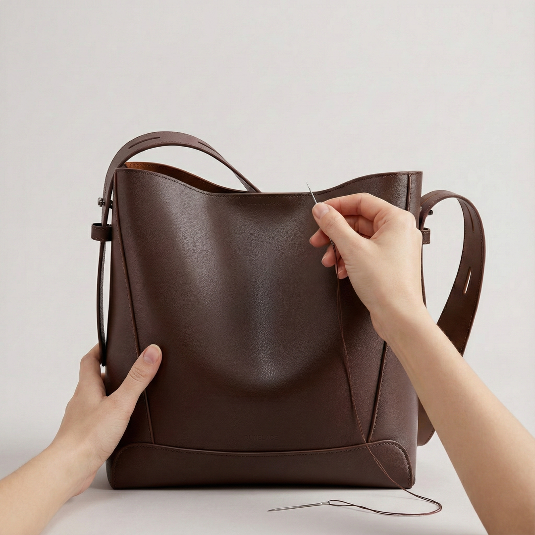 De rien d'autre que vos mains. Le kit contient tout : pièces prédécoupées, fil ciré, aiguilles, quincaillerie et accès au tutoriel vidéo. Aucune machine à coudre, aucun outil supplémentaire.