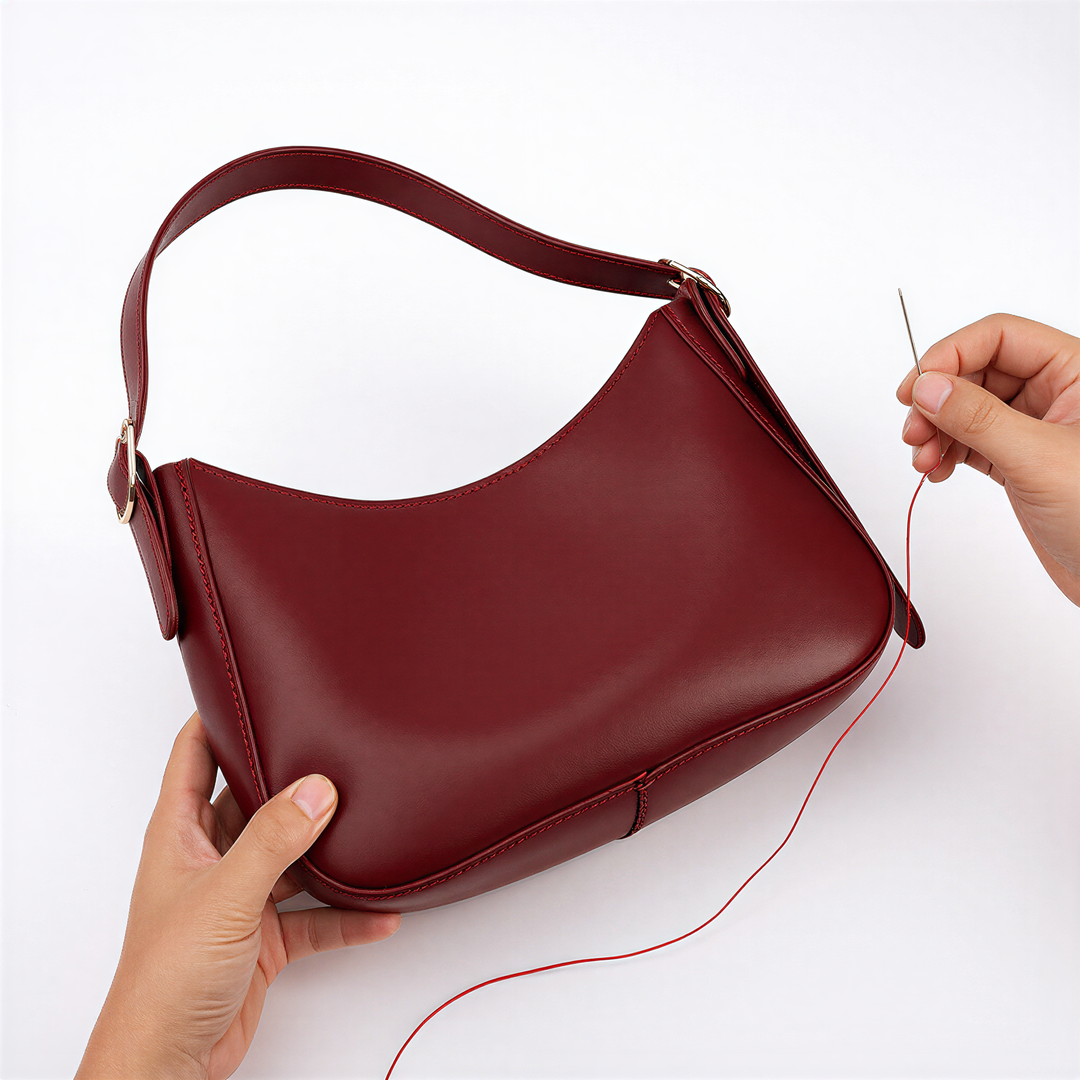 De rien d'autre que vos mains. Le kit contient tout : pièces prédécoupées, fil ciré, aiguilles, quincaillerie et accès au tutoriel vidéo. Aucune machine à coudre, aucun outil supplémentaire.