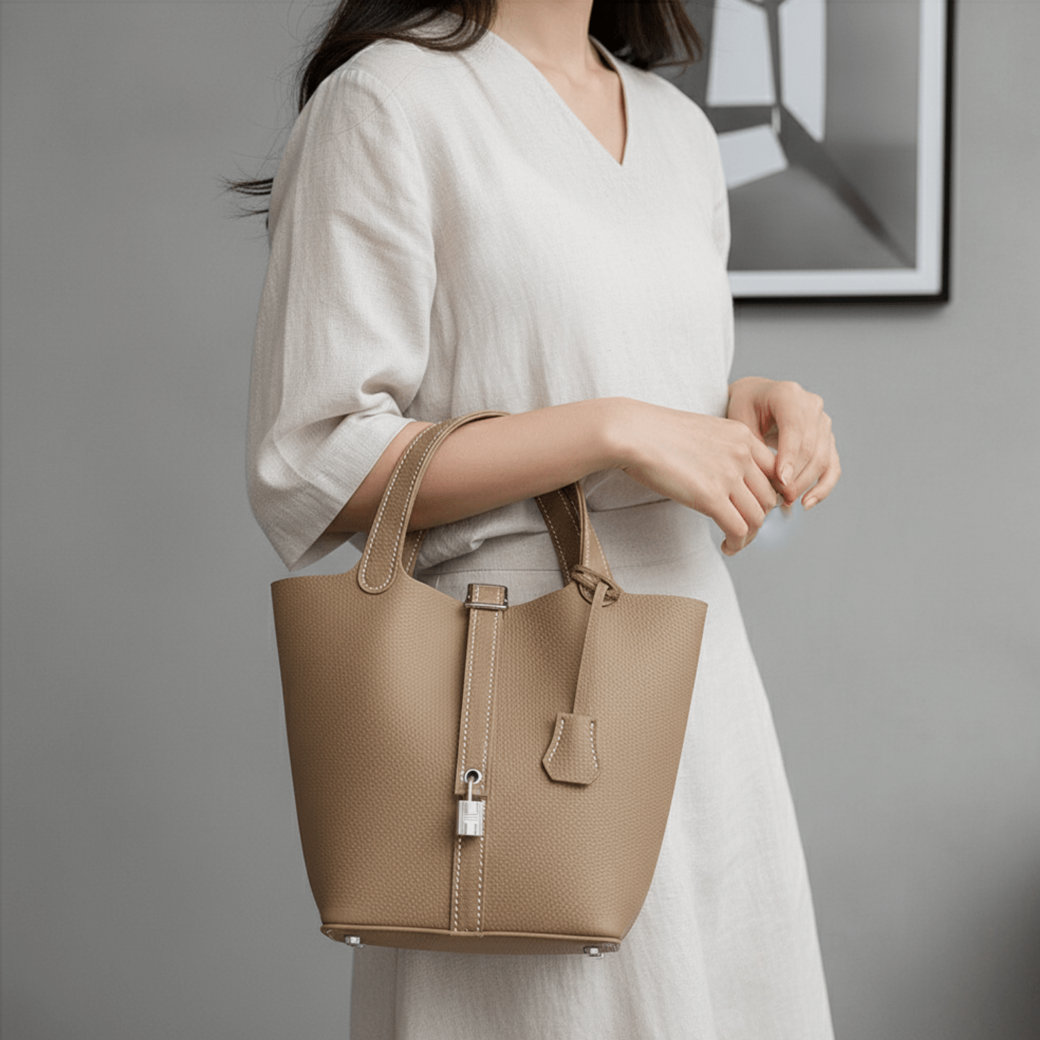 Le sac Paula, c’est le charme d’un seau structuré à coudre soi-même. Avec sa silhouette douce et arrondie, ses détails argentés et son petit cadenas en guise de signature, il allie simplicité et caractère.