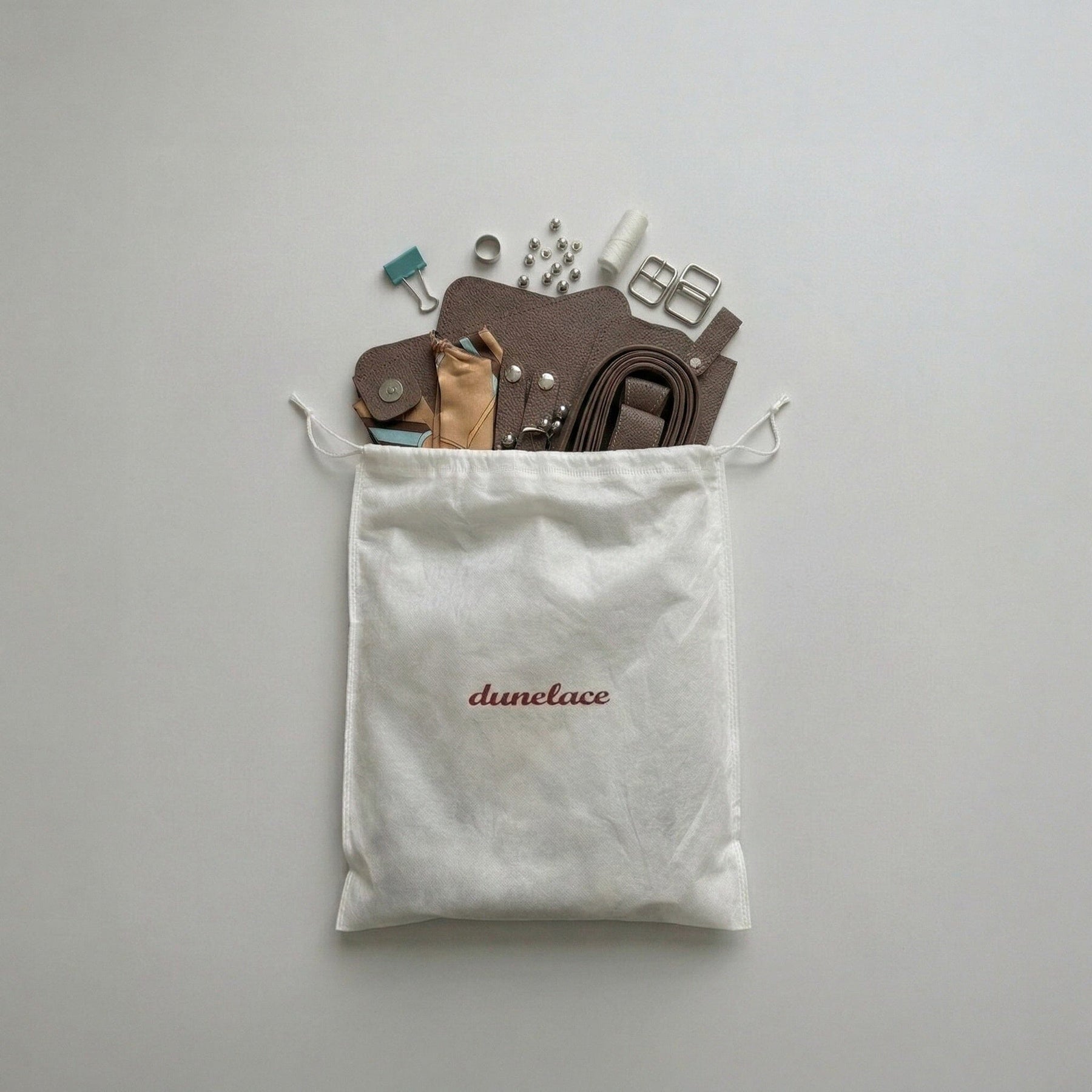 Nothing but your hands. The kit contains everything: pre-cut pieces, waxed thread, needles, hardware, and access to a video tutorial. No sewing machine, no additional tools required.