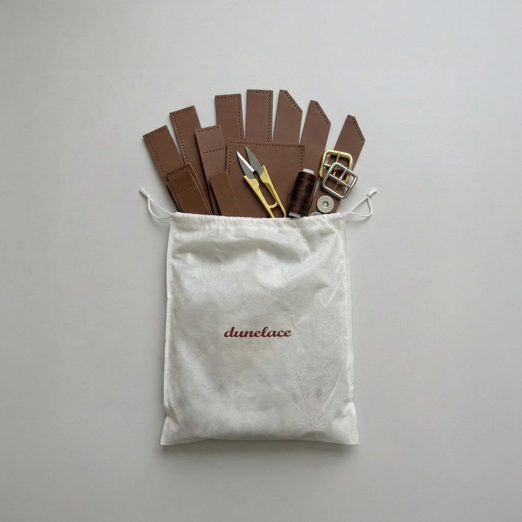 Nothing but your hands. The kit contains everything: pre-cut pieces, waxed thread, needles, hardware, and access to a video tutorial. No sewing machine, no additional tools required.